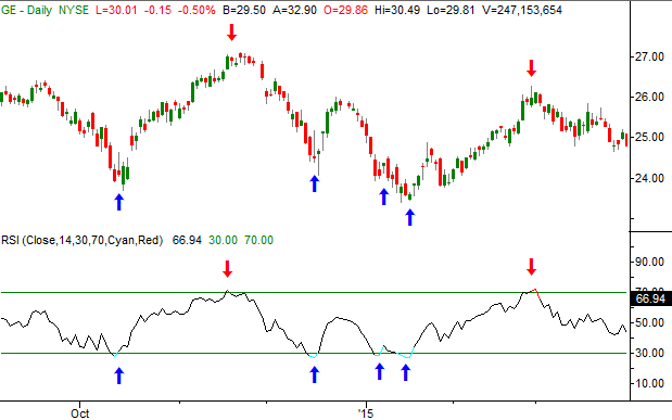 Este oscilador siempre fluctúa entre 0 y 100, de tal forma que cuando está próximo al 100 y se gira hacia abajo quiere decir que hay un máximo en el precio, con la consecuencia de especular o invertir a la baja para aprovecharnos de ese rebote hacia abajo. Por otro lado si el RSI se encuentra cercano al 0 y se gira hacia arriba indicará que el precio a llegado a un mínimo y rebotará hacia arriba tomando por consiguiente la acción de tomar posiciones largas o al alza.